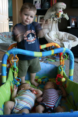 Harvick seems to be doing well, all things considered. Already this morning he is acting more like himself. The biggest challenges we face with him are how I will nurse him (hopefully, I will still find a way that I can do it in tandem with Jarrett), and how to position him. Fortunately, he is comfortable on his back (even though he has previously often preferred being on his stomach); and, he can sit in both the swing and the Nap Nanny.